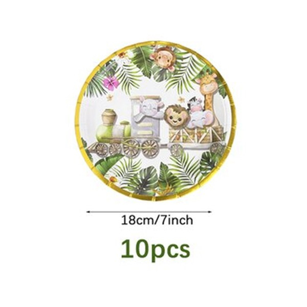 Transforma petrecerea micutului tau intr-o adevarata aventura in jungla cu acest set de farfurii cartonate cu tematica safari! Fiecare farfurie este decorata cu un tren simpatic plin cu animale zambitoare – leu, girafa, elefant, zebra si maimuta – inconjurat de frunze exotice si flori tropicale. Marginea aurie adauga un plus de eleganta decorului.