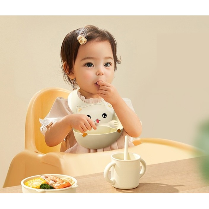 Set 2 Piese Diversificare Bebeluși și Copii din Silicon, Model Pisicuță, Bej, Fără alergeni, potrivit >12 luni