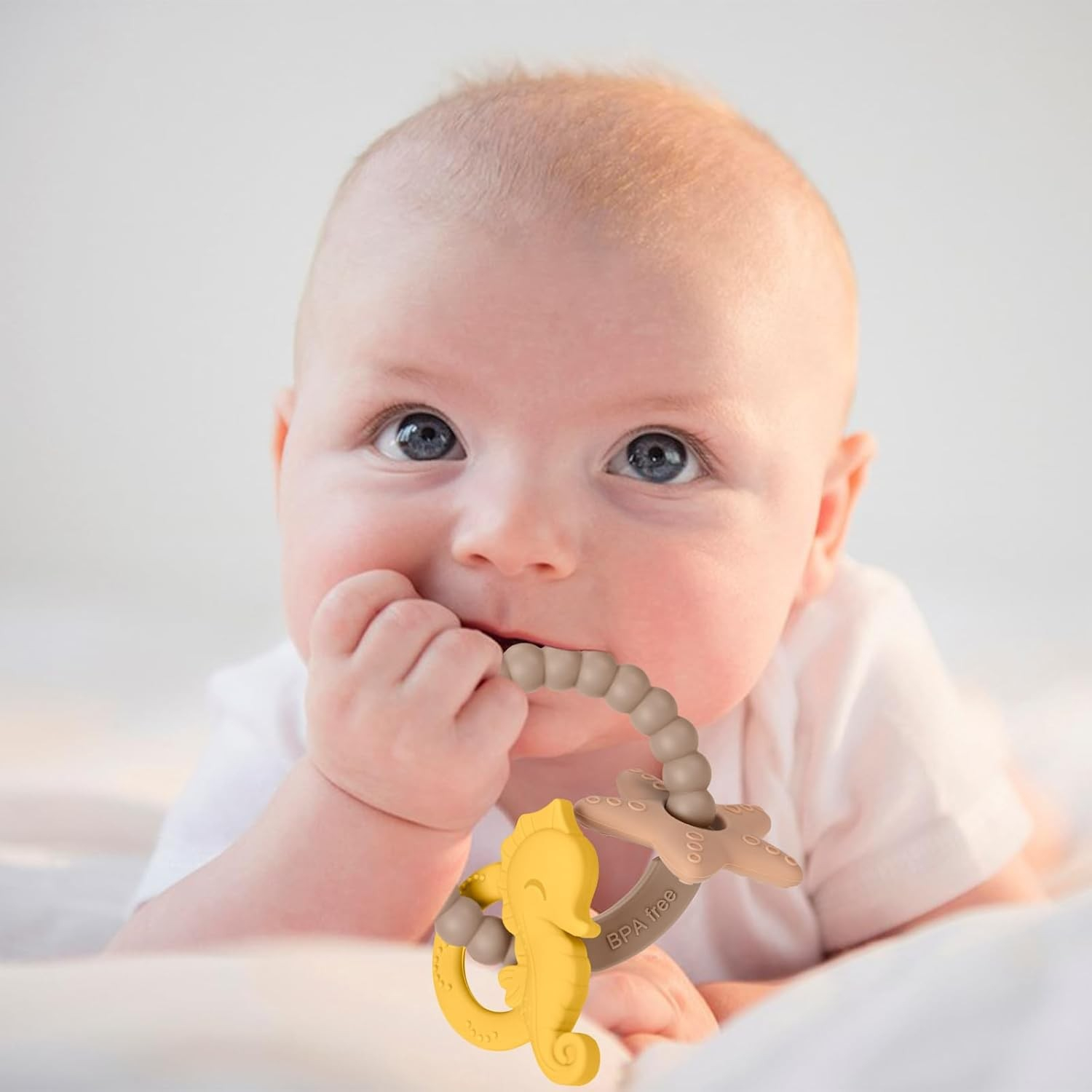 Jucărie Dentiție Bebeluși, Tip Brățară, Model Căluț și Stea de Mare, +3 luni, din Silicon, fără BPA, 8.1 x 8.1 x 1.2 cm