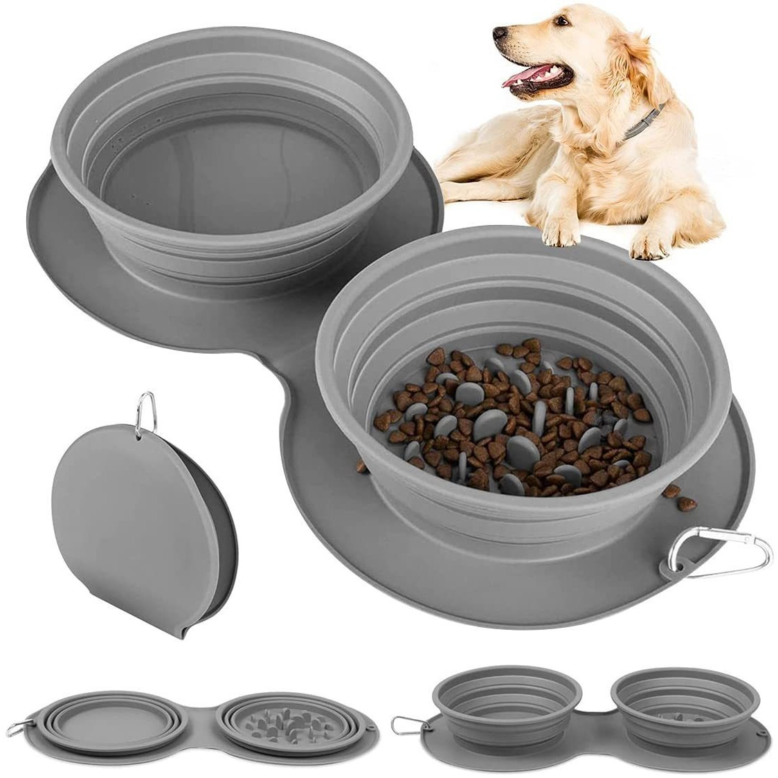 Bol Dublu pentru Animalul de Companie, din Silicon, Pliabil, Inaltime Reglabila, Antialunecare, 42 x 21 x 5 cm, Gri