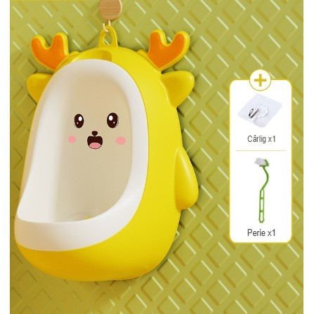 Pisoar pentru Baieti, 0-8 Ani, in Forma de Cerb, Perie Inclusa, Montare pe Perete, Carlig Autoadeziv Inclus, 29.8 x 23.8 cm, Galben