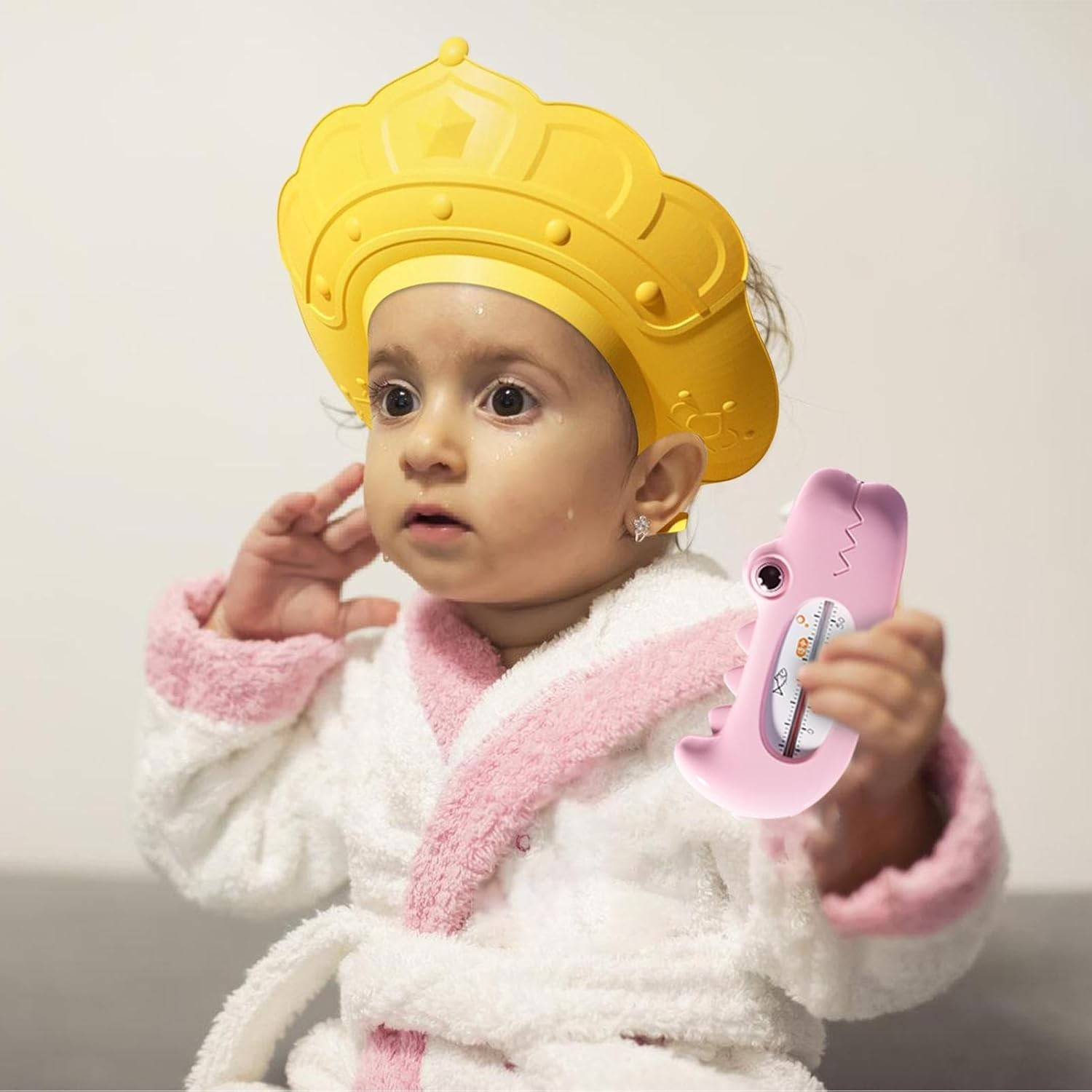 Casca de Dus, Previne Scurgerea Apei si Samponului pe Fata, 0-12 Ani, Ajustabila, din TPE+PP, 20 x 23 cm, Model Coroana, Galben