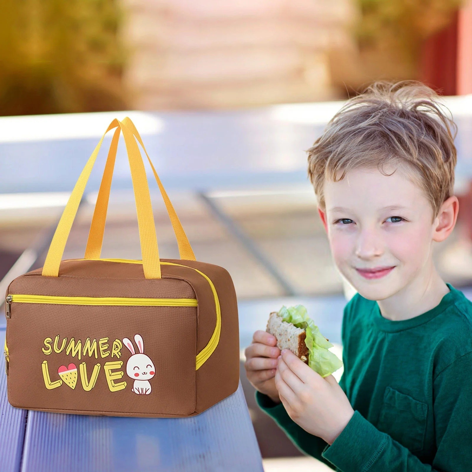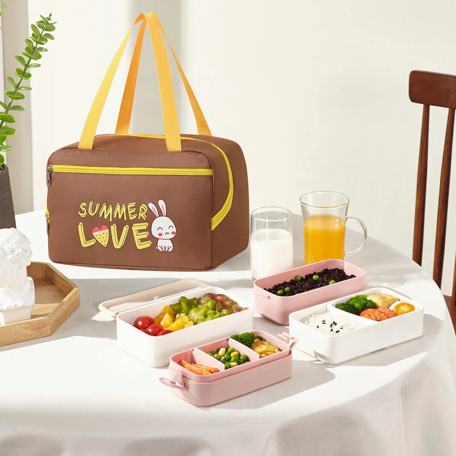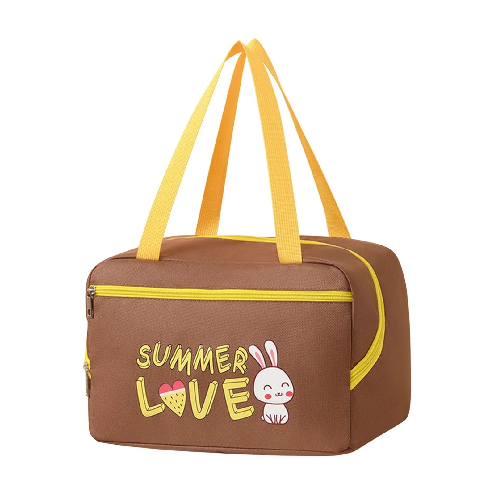 Geantă Termo-Izolantă cu Compartimente pentru Telefon și Tacâmuri, 30 x 21 x 20 cm, Design Iepuraș, Maro