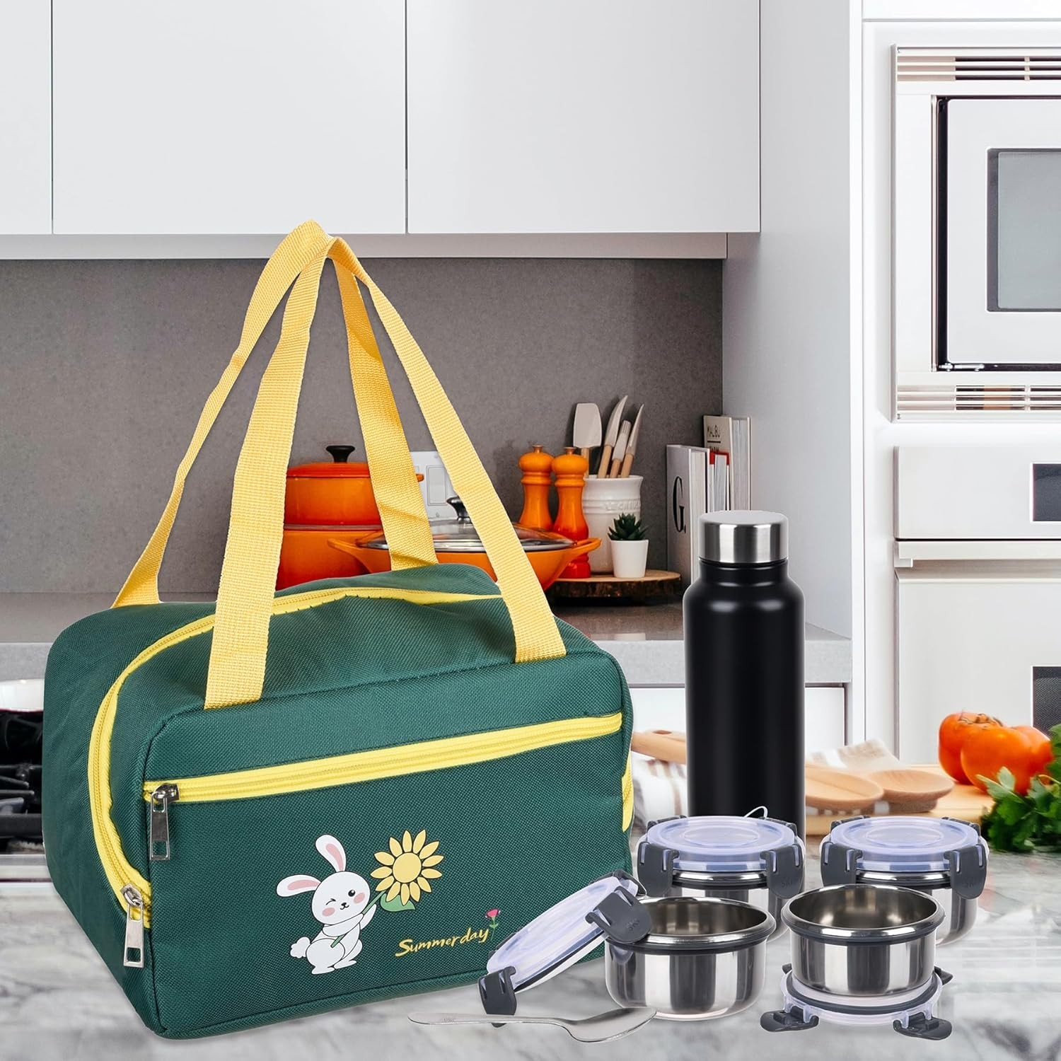 Continut Pachet: Geanta Termo-Izolanta, Flippy, Compartimente Telefon si Tacamuri, Multifunctionala, Impermeabila, 30x21x20 cm, Design Iepuras, Verde