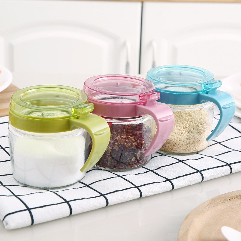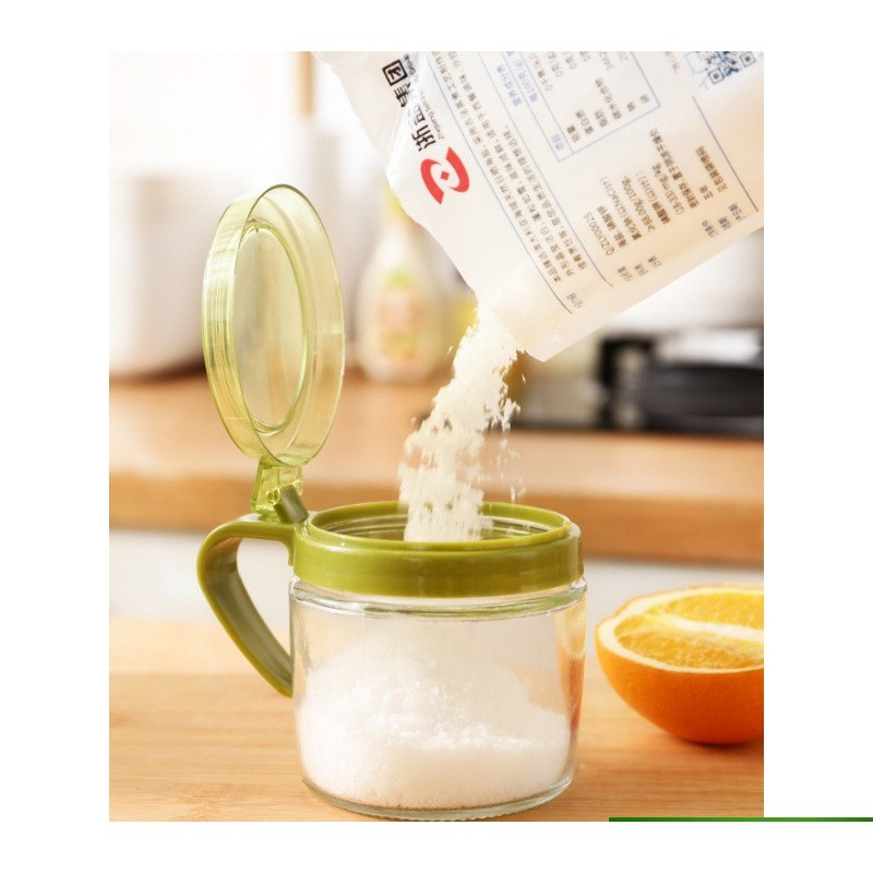 Recipient Condimente din Sticlă, 180 ml, cu Mâner și Linguriță, 8 x 9 cm, Capac Transparent
