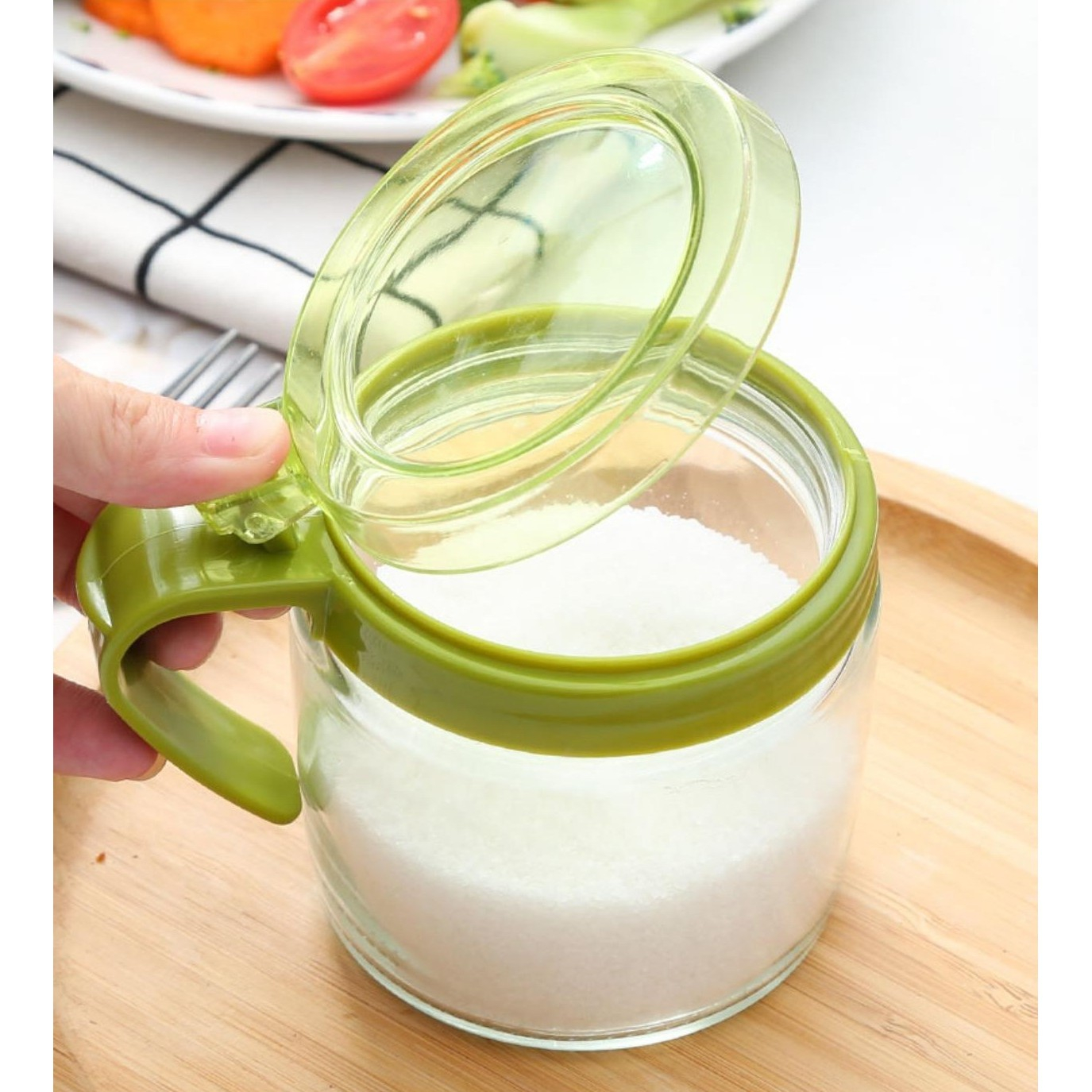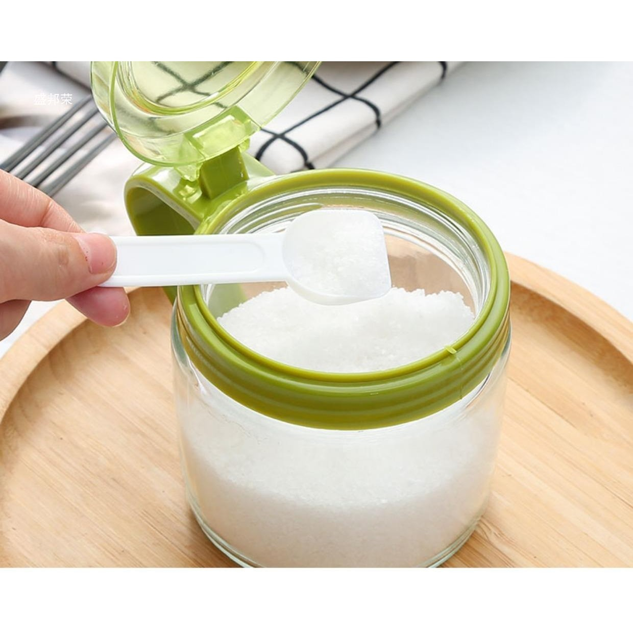Recipient Condimente, din Stilca, 180 ml, cu Maner si Lingurita, 8 x 9 cm, Capac Transparent, Verde
