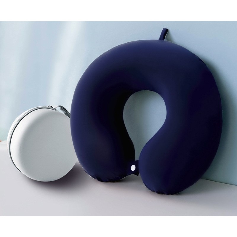 Perna de Calatorie in Forma de U, Pentru Gat si Cap, Umplutura din Spuma cu Memorie, 30x30 cm, Sistem Prindere Capse, Cutie de Depozitare, Albastru Marin