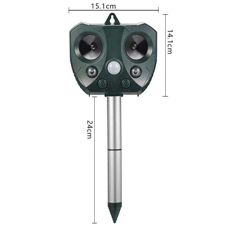 Iluminare LED: Aparatul este dotat cu lumină roșie și albă, oferind o combinație eficientă între ultrasunete și semnale vizuale pentru a speria animalele.