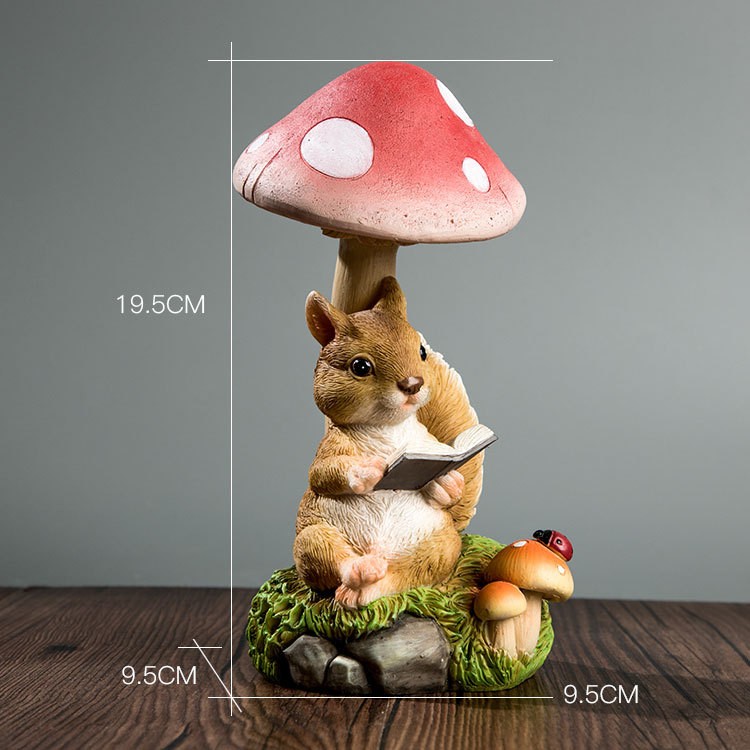 Decoratiune de gradina – Veverita cu carte sub ciuperca rosie, model luminos, rasina rezistenta