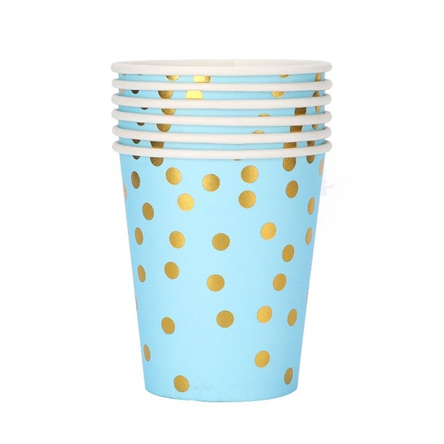 Set 10 Pahare, Imprimeu cu Buline, din Carton, 250 ml, 7.5 x 8.5 x 5.2 cm, Albastru/Auriu