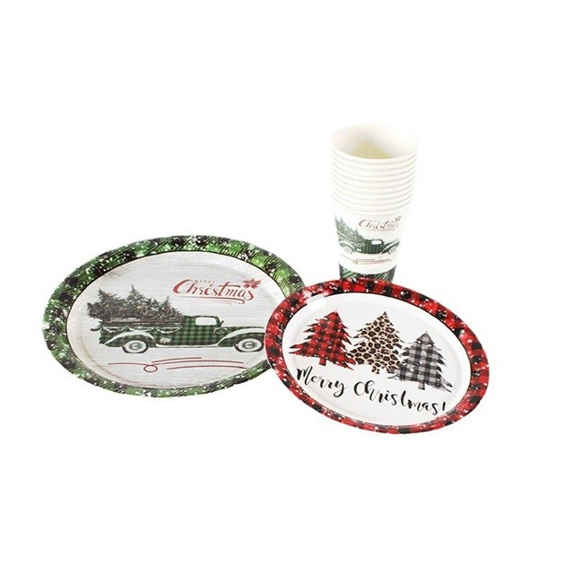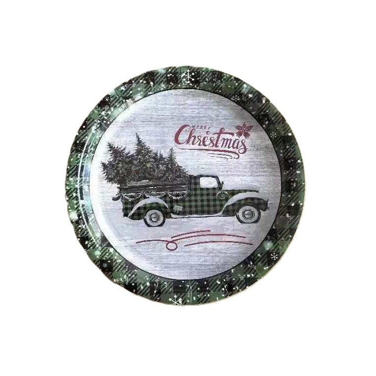 Setul de 10 farfurii de unică folosință cu model Mașina de Crăciun, este perfect pentru a adăuga un aer festiv mesei tale de sărbători.