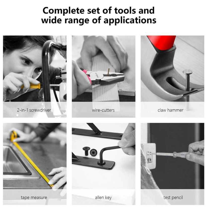 Setul include: banda de masurat din otel de 2 metri, 12 bucati de surubelnite, 6 bucati de chei hexagonale, banda electrica, cleste de sarma de otel de 6 inchi, creion de testare 100-500 V, maner de biti, ciocan de gheare de 4 oz.