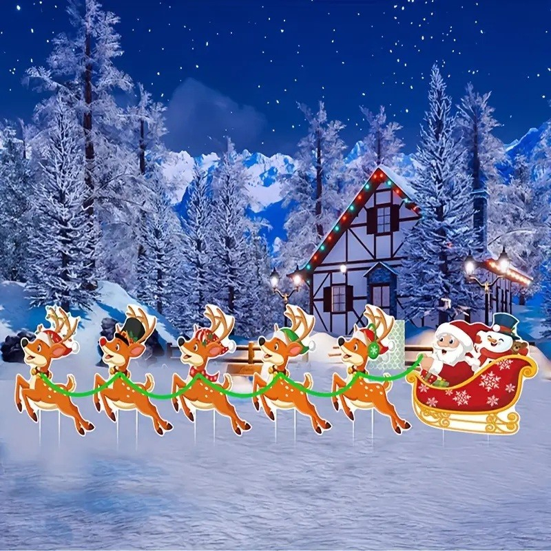 Continut Pachet: Decoratiune de Craciun, Flippy, pentru Gradina, Tip Trenulet, 6 Figurine + Bete de Infipt in Pamant, din Plastic, Impermeabil, Model Mos Craciun cu Renii, Multicolor