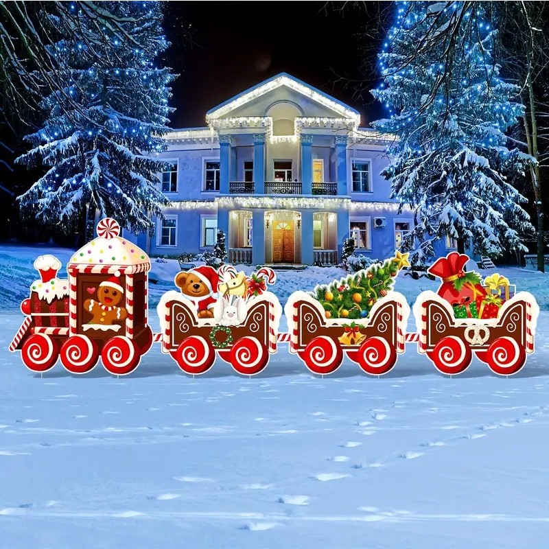Continut Pachet: Decoratiune de Craciun, Flippy, pentru Gradina, Tip Trenulet, 4 Figurine + Bete de Infipt in Pamant, din Plastic, Impermeabil, Model Tren cu Omul Briosa, Multicolor