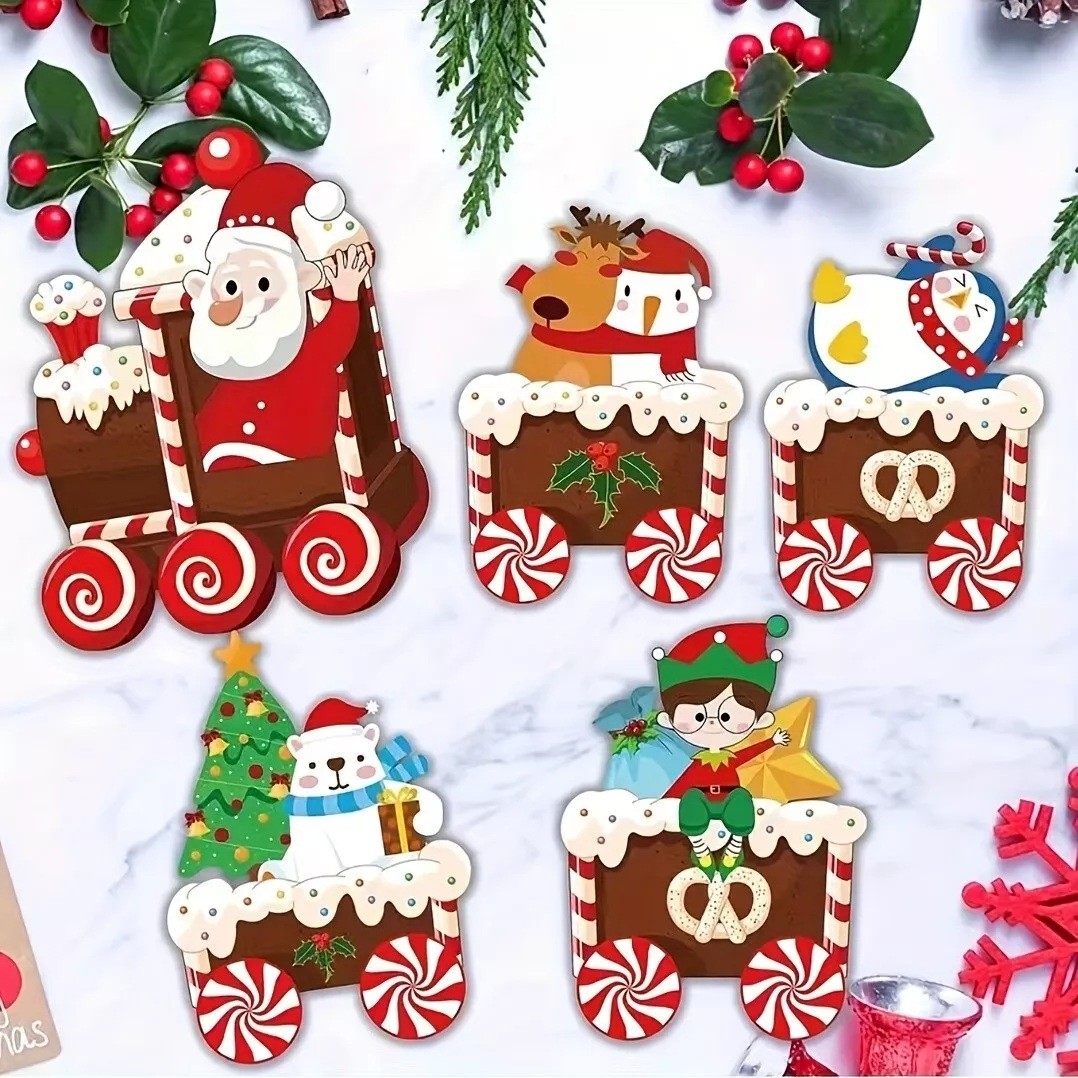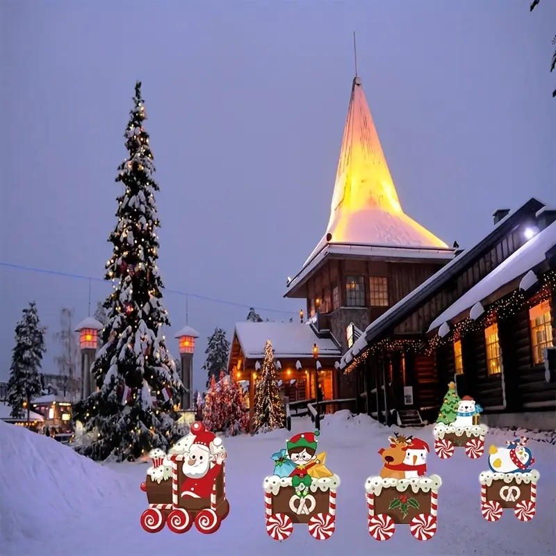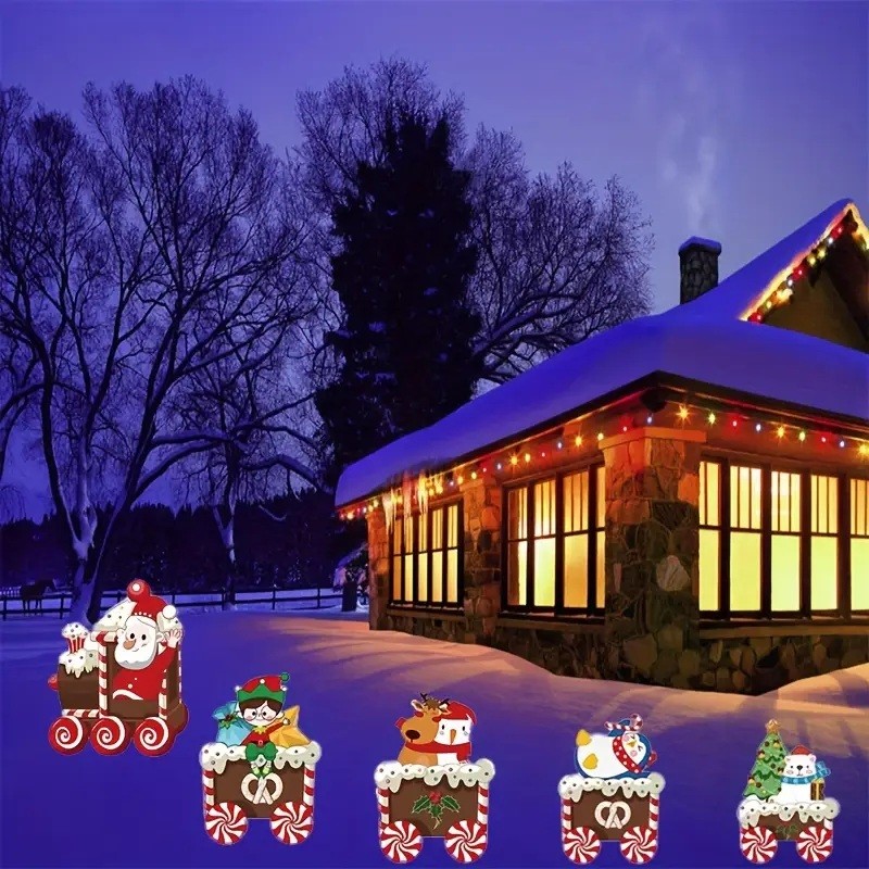 Continut Pachet: Decoratiune de Craciun, Flippy, pentru Gradina, Tip Trenulet, 5 Figurine + Bete de Infipt in Pamant, din Plastic, Impermeabil, Model Mos Craciun cu Prietenii, Multicolor