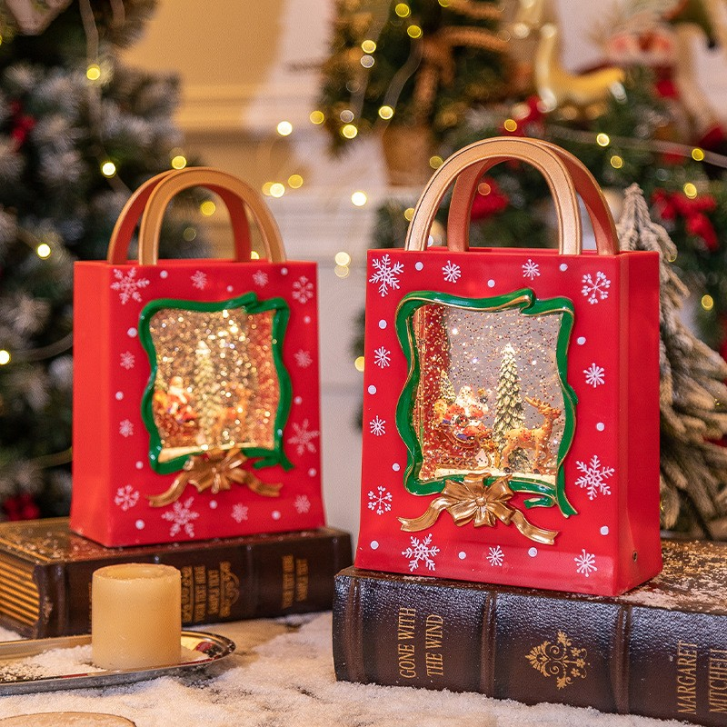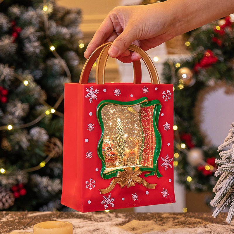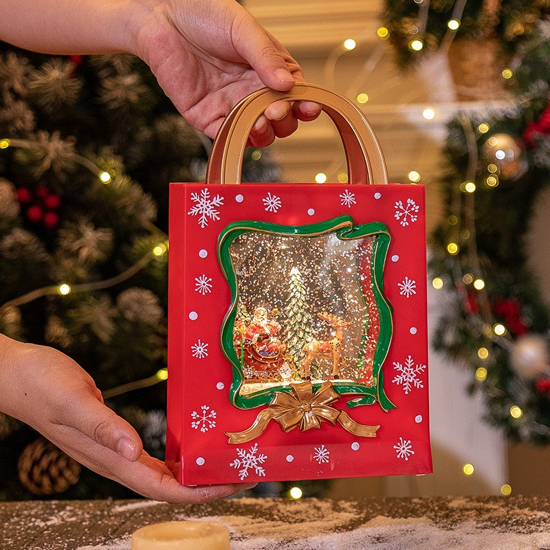 Decoratiune de Craciun in forma de sacosa – glob luminos cu Mos Craciun si ren, efect zapada