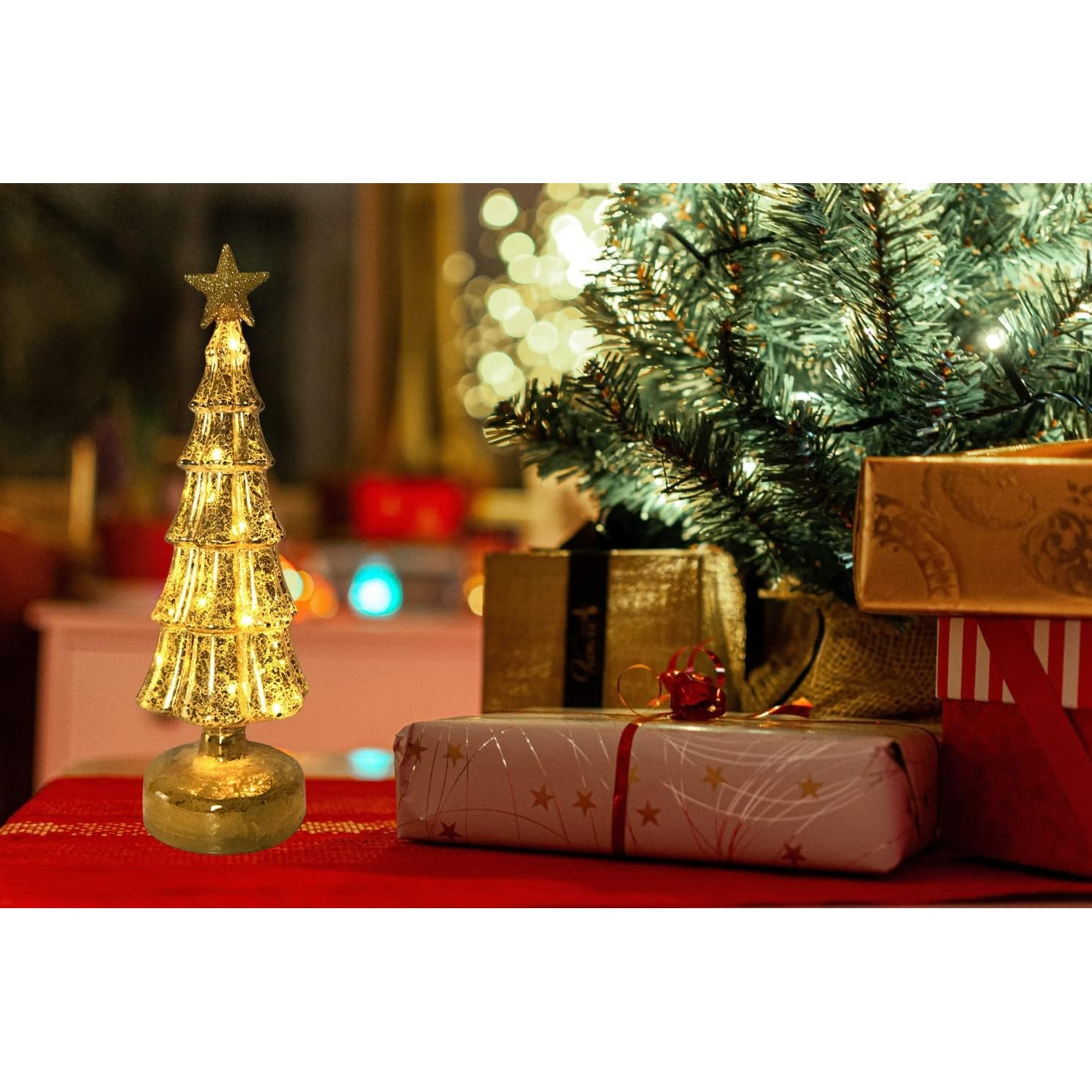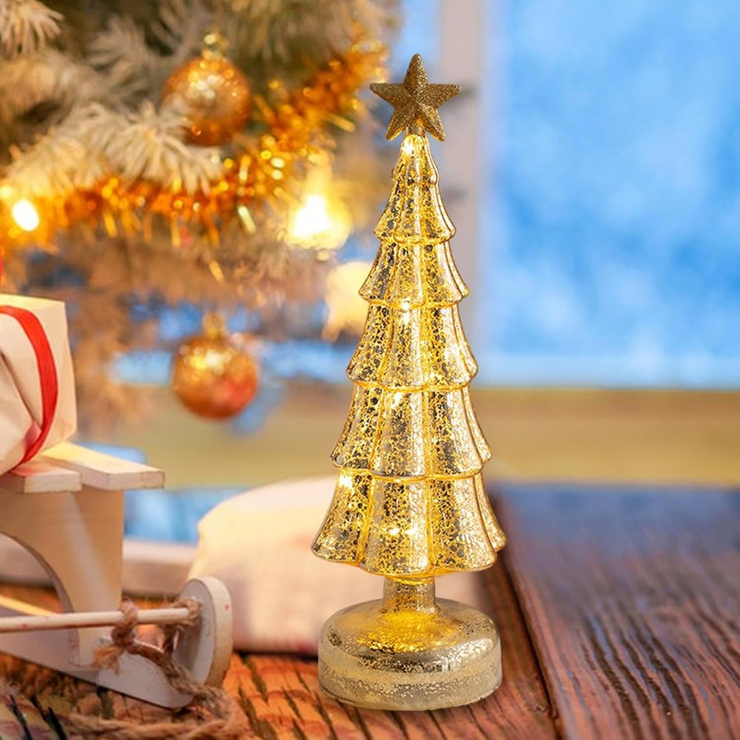 Decorațiune de Crăciun Model Brad cu Stea, din Sticlă, cu Lumini, 31.5 x 9 cm, Auriu