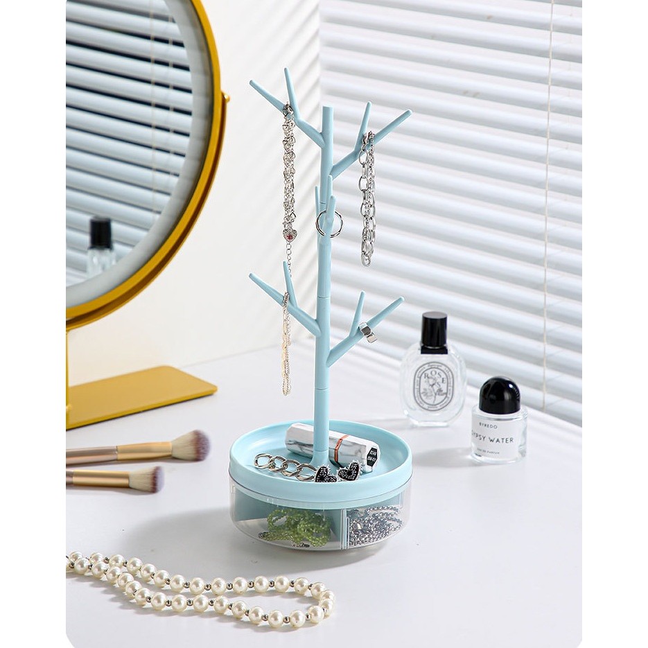 Această cutie de bijuterii are un design rotativ, elegant și funcțional, proiectată în formă de copac, cu ramuri care permit agățarea colierelor, brățărilor, inelelor și altor accesorii. Partea inferioară este echipată cu o tavă de depozitare cu 4 compartimente separate, ceea ce oferă spațiu suplimentar pentru organizare.