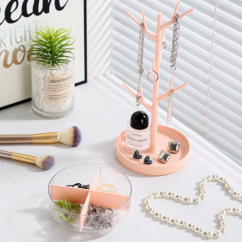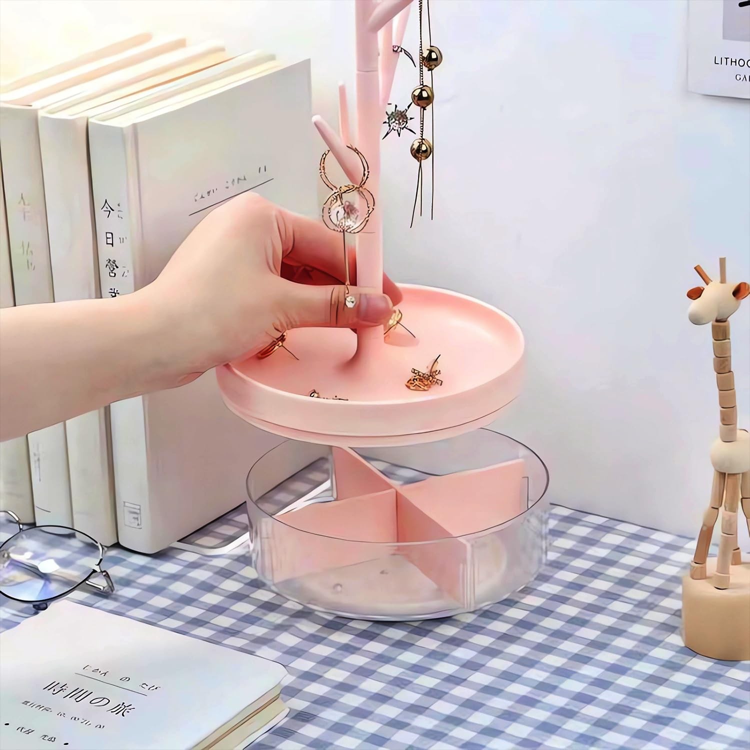 Această cutie de bijuterii are un design rotativ, elegant și funcțional, proiectată în formă de copac, cu ramuri care permit agățarea colierelor, brățărilor, inelelor și altor accesorii. Partea inferioară este echipată cu o tavă de depozitare cu 4 compartimente separate, ceea ce oferă spațiu suplimentar pentru organizare.