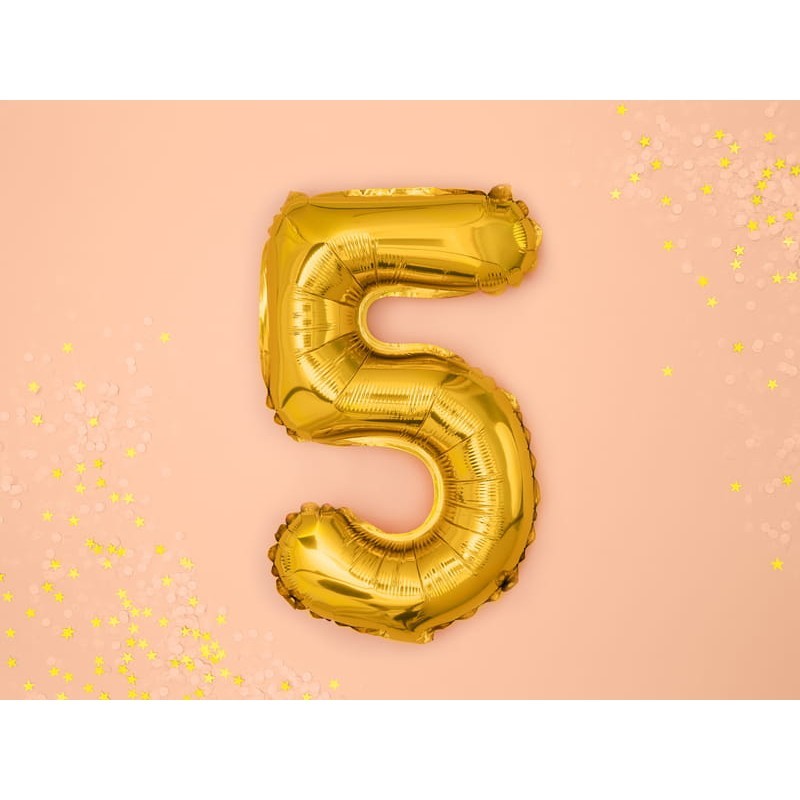 Balon din Folie Metalizata Figurina Cifra, Tema Aniversare 100 cm, Ambalaj Individual, Pai inclus, Umflare cu Aer sau Heliu, Auriu, Cifra 5