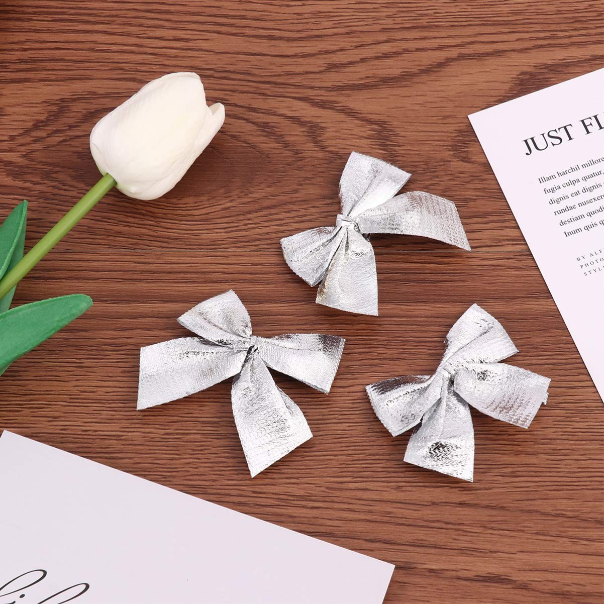 Set 12 Fundite decorative Craciun realizate din panglica argintie. Aceste fundite sunt ideale pentru decorarea bradului de Craciun, pentru personalizarea unui cadou sau pentru decorarea unui spatiu din locuinta, pentru a realiza un decor de poveste.