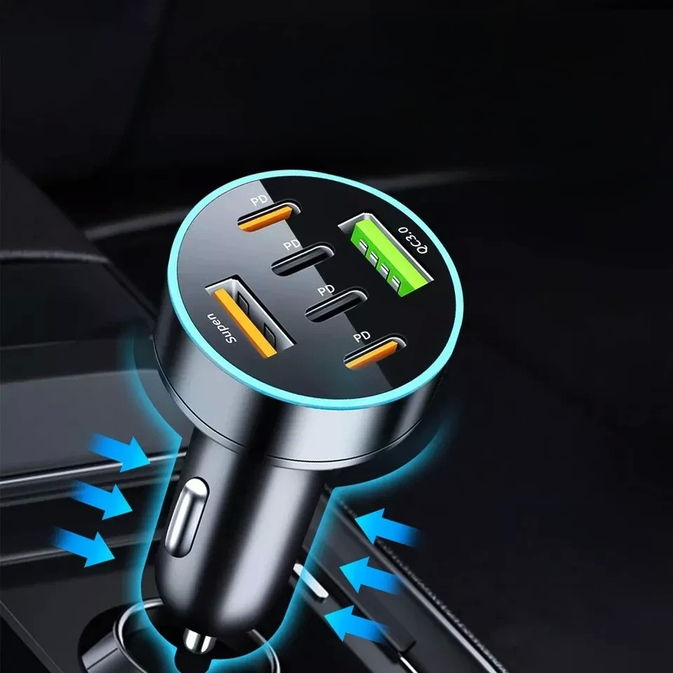 Acest încărcător auto 6 în 1 este perfect pentru utilizarea în mașină, în special pentru familii sau grupuri care au nevoie să încarce mai multe dispozitive în același timp, fie că este vorba de smartphone-uri, tablete sau alte dispozitive electronice.
