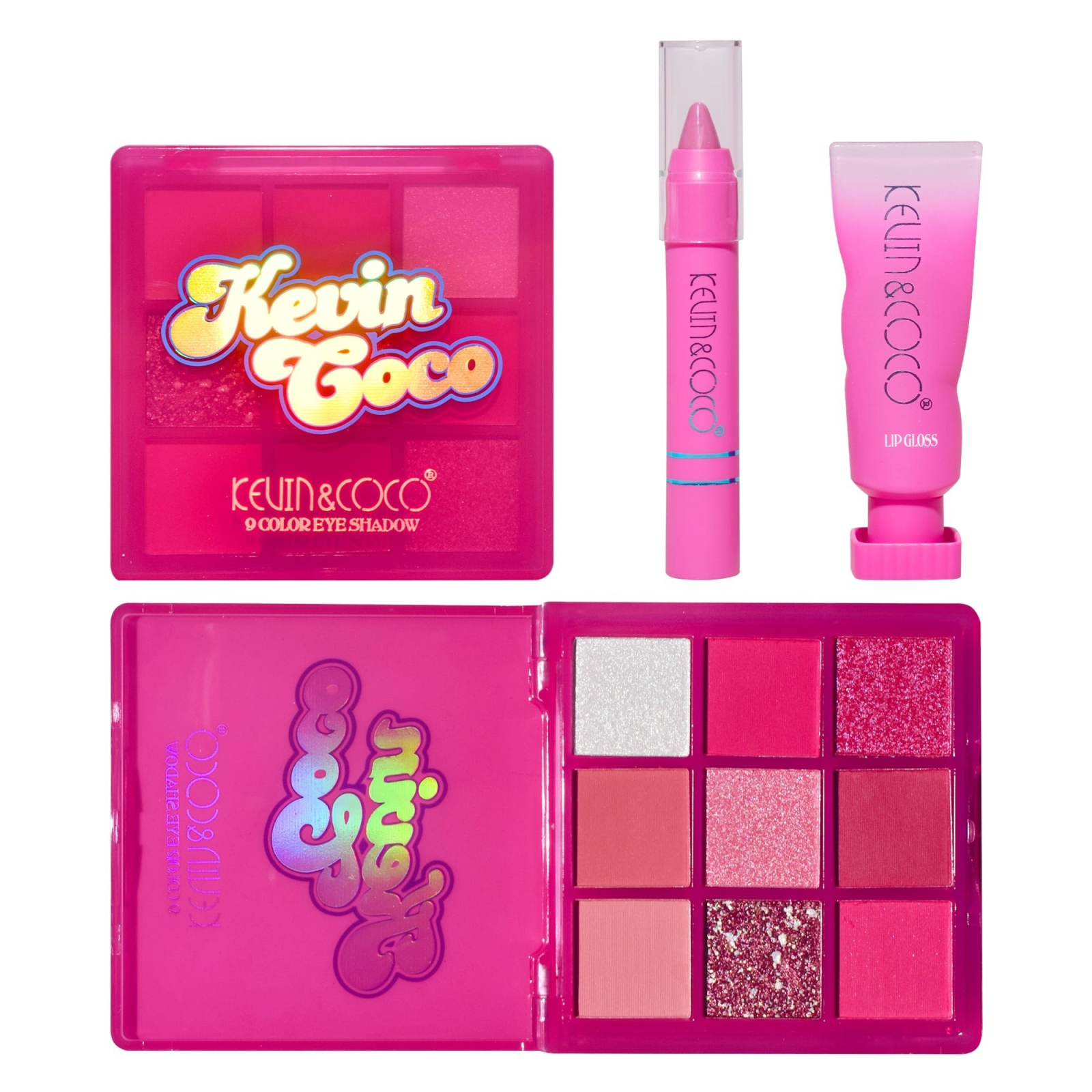 Set 3 Produse de Machiaj, KEVIN & COCO, Pink Hearted, 9 culori, 15.5 x 13 x 3.4 cm