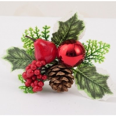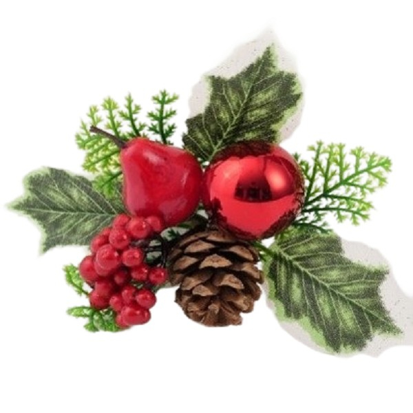 Acest buchețel decorativ pentru Crăciun este perfect pentru a aduce spiritul sărbătorilor în casa ta. Realizat din plastic de calitate, imită conurile și frunzele specifice Crăciunului, în culori festive de verde, roșu și maro. Ideal pentru ornamente de masă, decoruri de ușă sau pentru a adăuga un plus de farmec natural aranjamentelor tale de Crăciun.