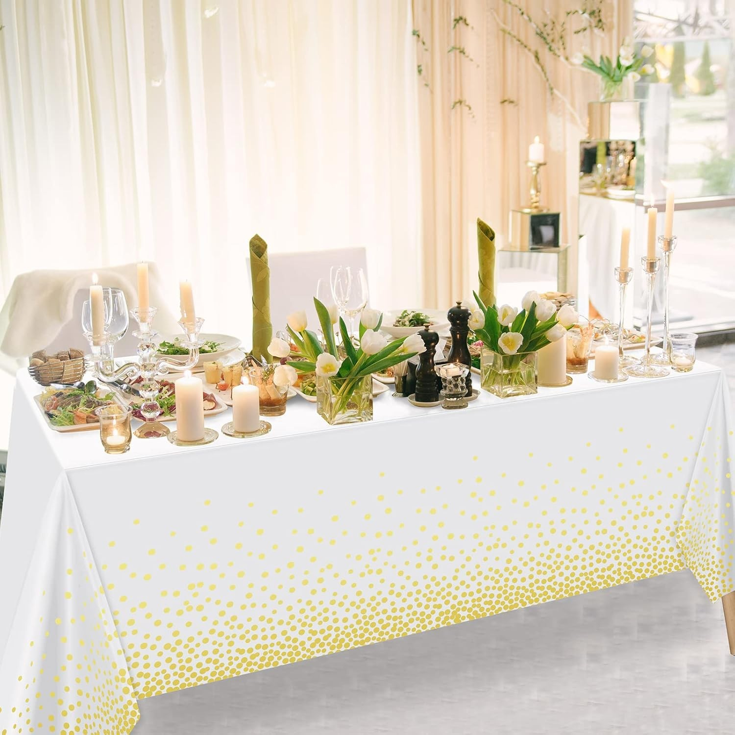 Transformă masa ta într-un decor elegant și festiv cu această față de masă din PEVA, decorată cu un imprimeu modern cu buline. Impermeabilă și anti-pete, este ideală pentru evenimente speciale precum nunți, botezuri, petreceri aniversare sau cine elegante.