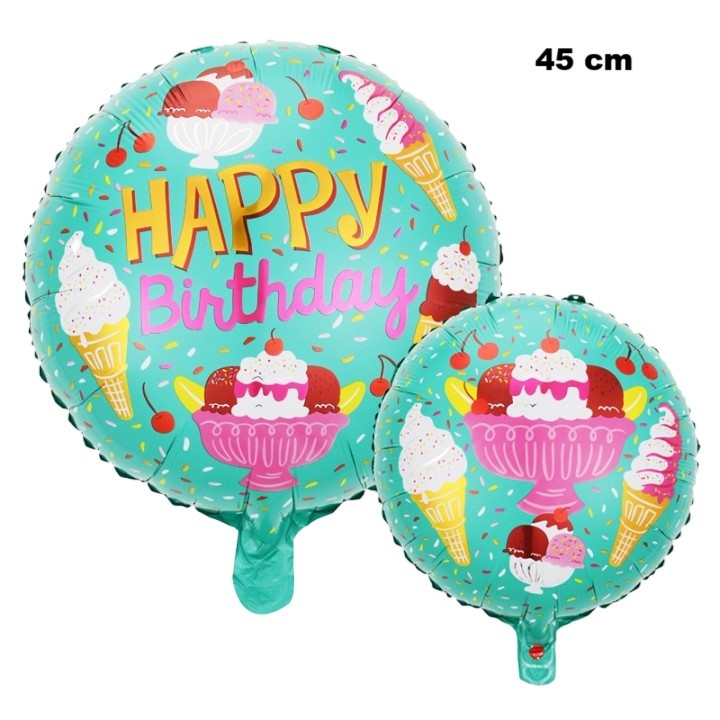 Balon din Folie Metalizata, Mini Figurina Rotunda, Model Inghetata, Happy Birthday, Tematica Aniversare, 45 cm, Ambalaj Individual, Pai Inclus, Umflare cu Aer sau Heliu, Verde