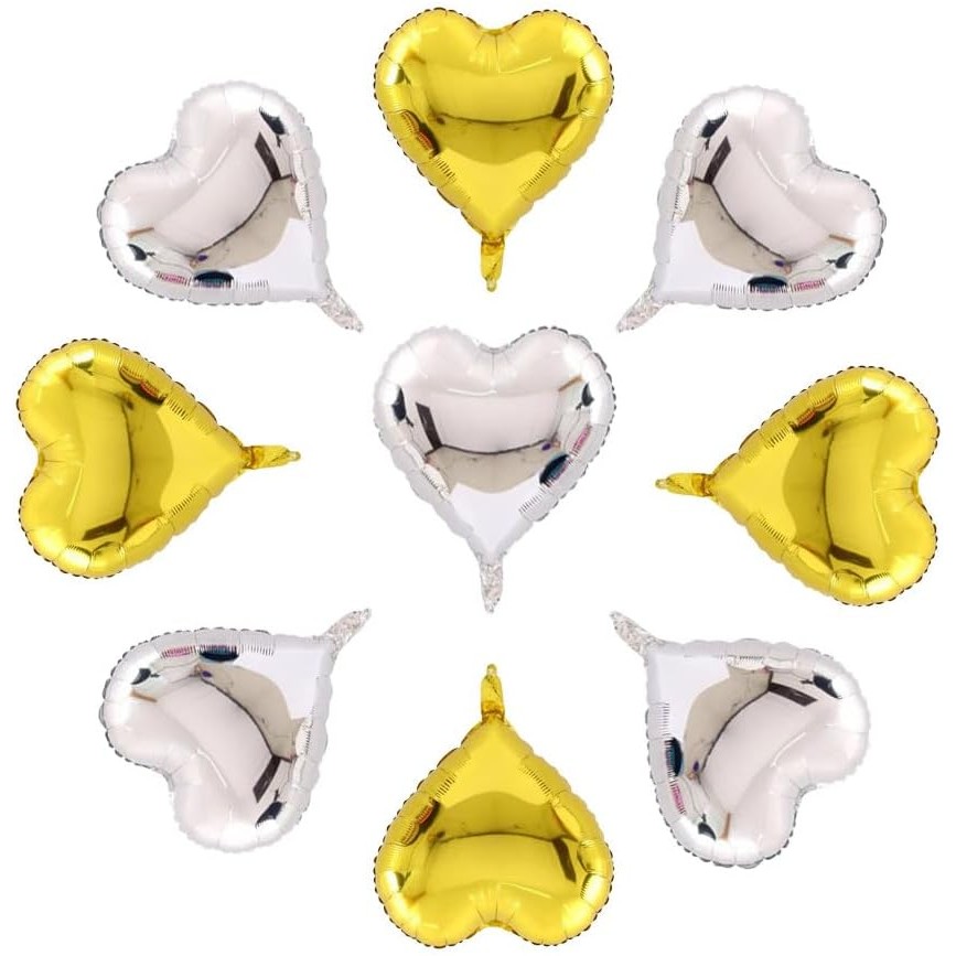 Set 2 Baloane din Folie Metalizata, Model Inimi, Tema Ziua Indragostitilor, 45 cm, Ambalaj Individual, Pai Inclus, Umflare cu Aer sau Heliu, Argintiu/Auriu
