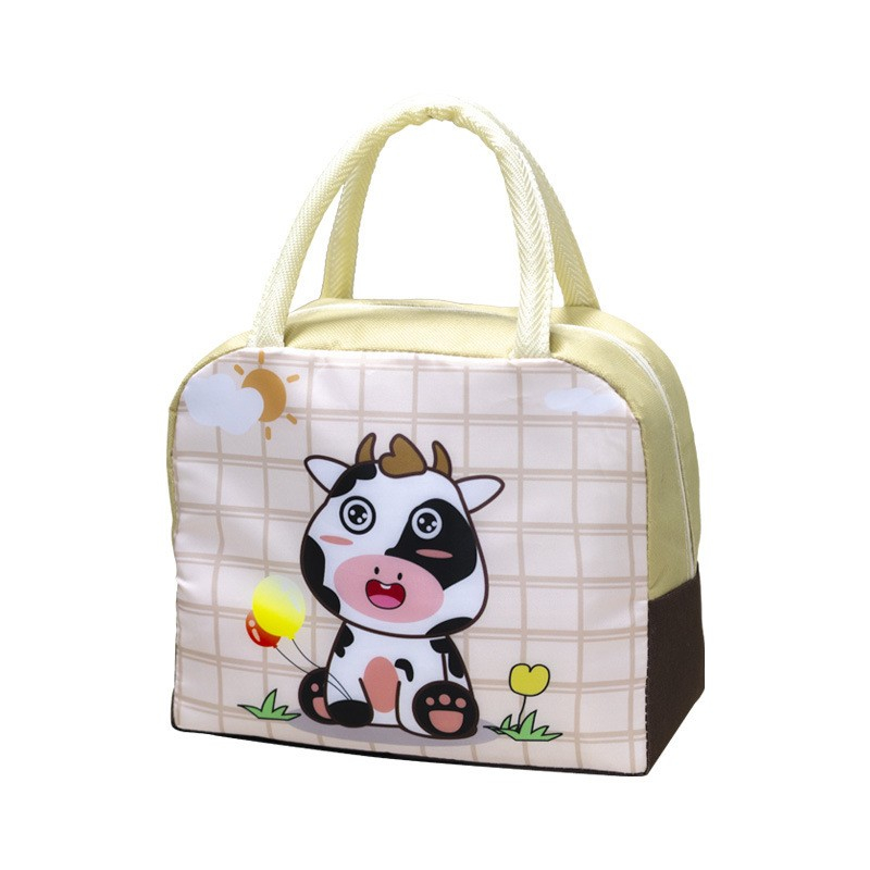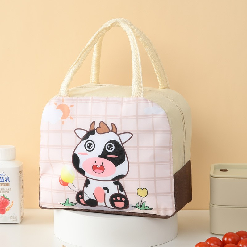 Geanta Termoizolanta pentru Copii, 23x13x19 cm, Model Imprimeu Vacuta, din Folie de Aluminiu si Panza Oxford, Bej