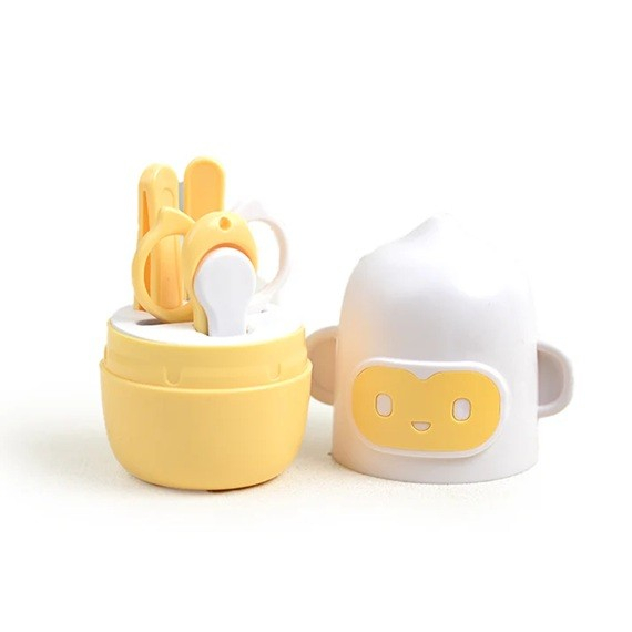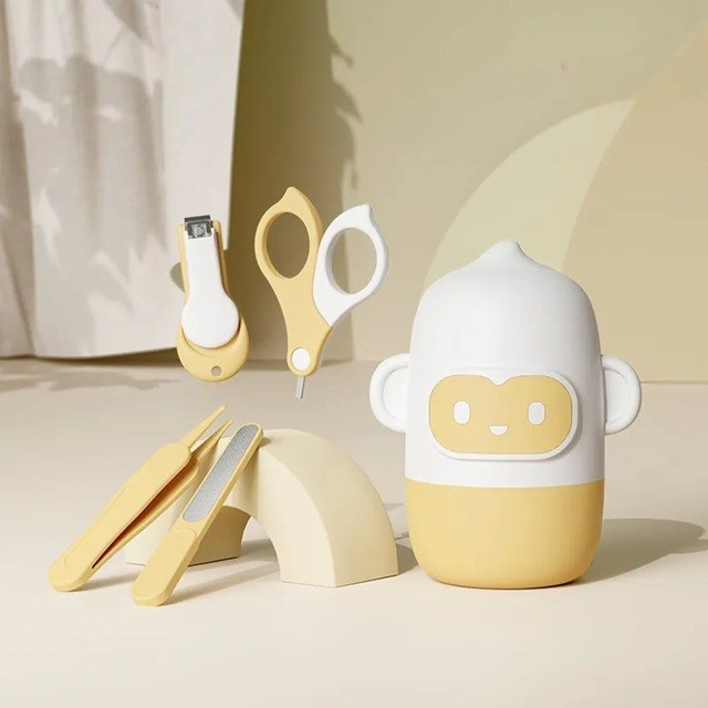 Set 4 Piese Ingrijire Unghii Bebelusi, din ABS+Otel Inoxidabil, Cutie de Depozitare Tip Maimuta, de la 0 Luni, Galben