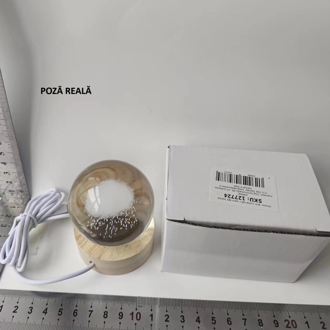 Lampa LED Decorativa, cu Bila de Cristal cu Diametru 6cm, Model Nor Ploios 3D, Alimentare USB, Suport din Lemn, Lumina Alb Cald