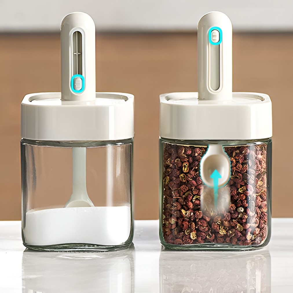 -Lingură reglabilă: borcan etanș de depozitare a condimentelor cu capac și lingură telescopică, înălțimea acesteia poate fi reglată liber și ușor.