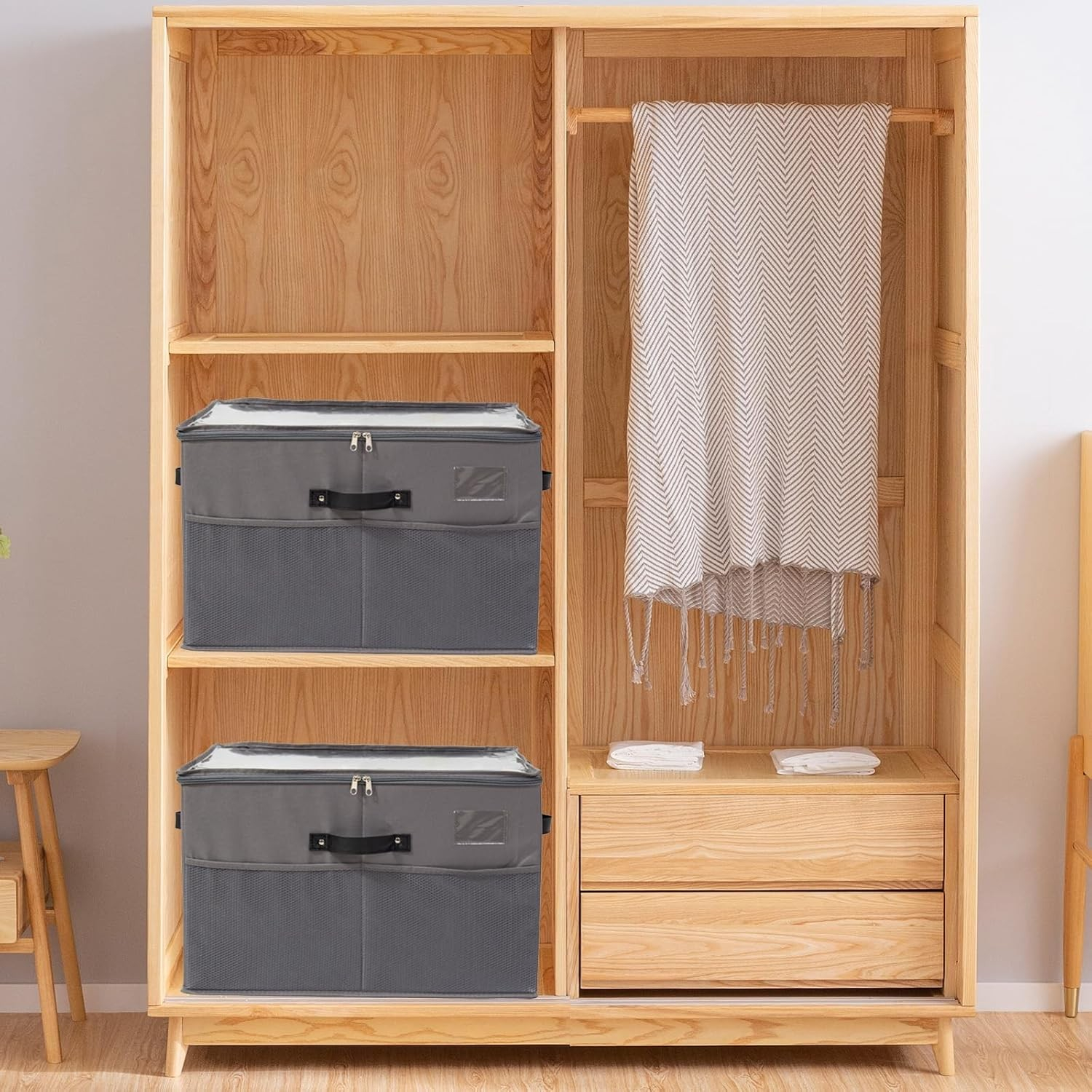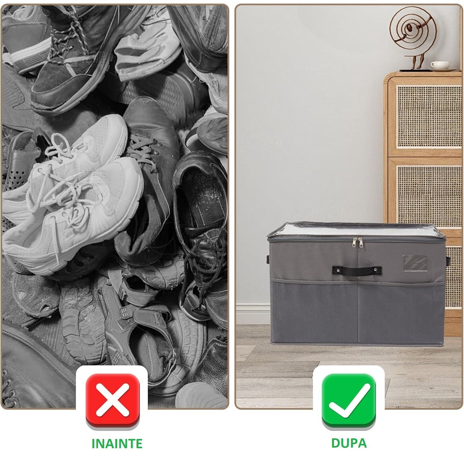 Continut Pachet: Cutie de Depozitare pentru Pantofi, Flippy, 53x42x33 cm, cu Capac Transparent si Fermoar, din Panza Oxford, Pliabila, Gri