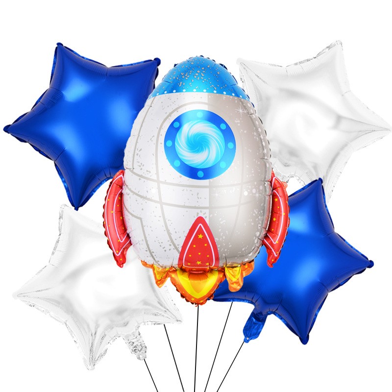 Set 5 baloane din folie metalizata HAPPY BIRTHDAY, Figurina Model Racheta, Stelute Albastre, Adeziv si pai incluse, 78 x 45cm, Albastru Alb