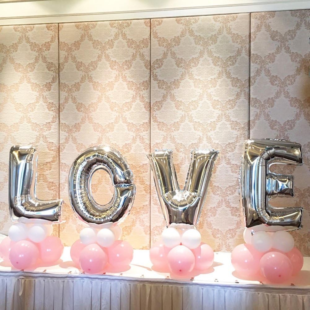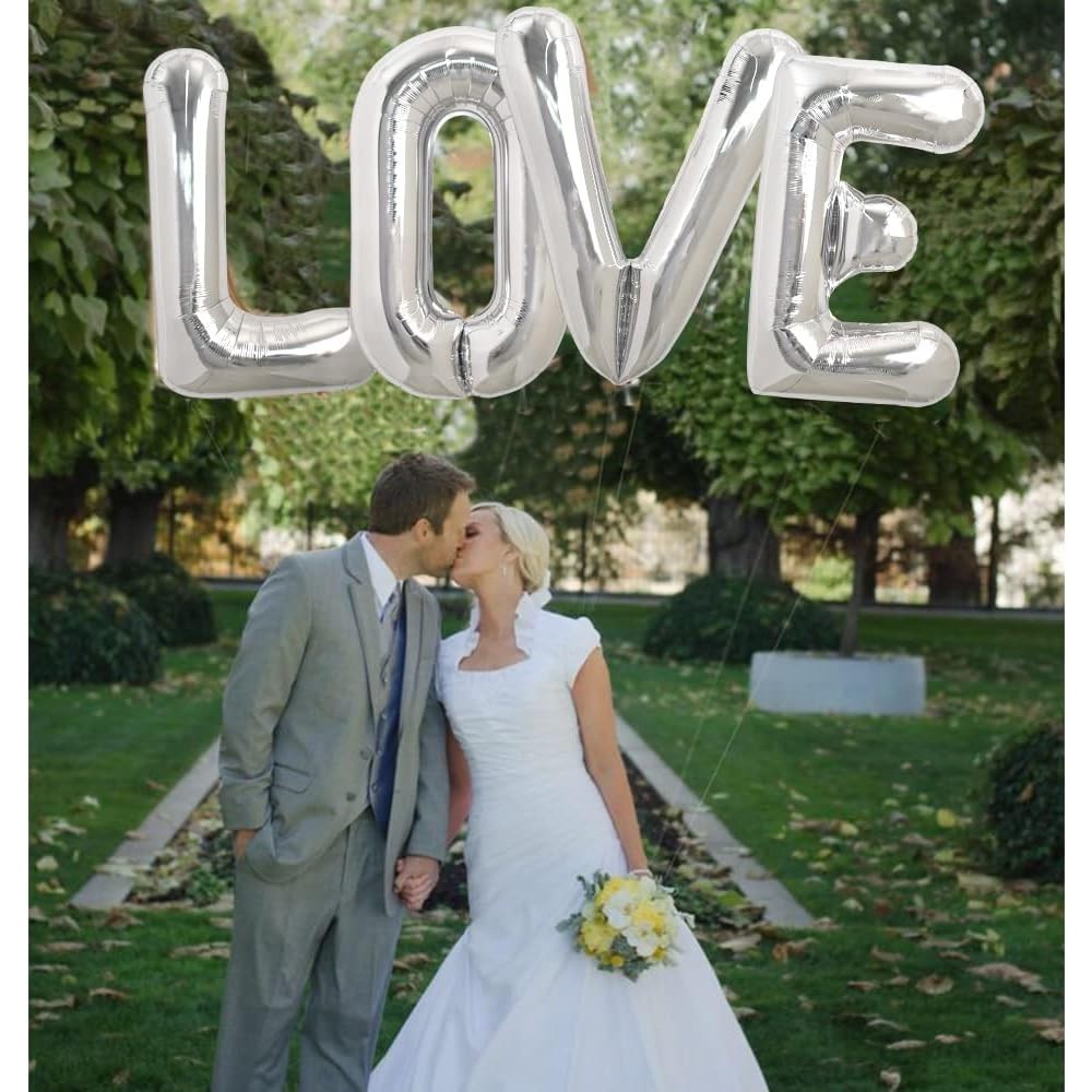 Set 4 Baloane din Folie Metalizata, Figurine Litere, Model Scris Love, Tema Iubire, 80 cm, Ambalaj Individual, Pai Inclus, Umflare cu Aer sau Heliu, Argintiu