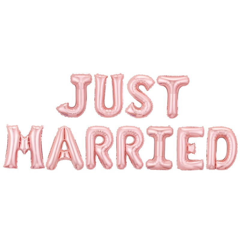 Set Baloane din Folie Metalizata, Model Just Married, Litere de 40 cm, Baloane Party, Ambalaj Individual, Pai, Ata si Adeziv Incluse, Umflare cu Aer sau Heliu, Roz