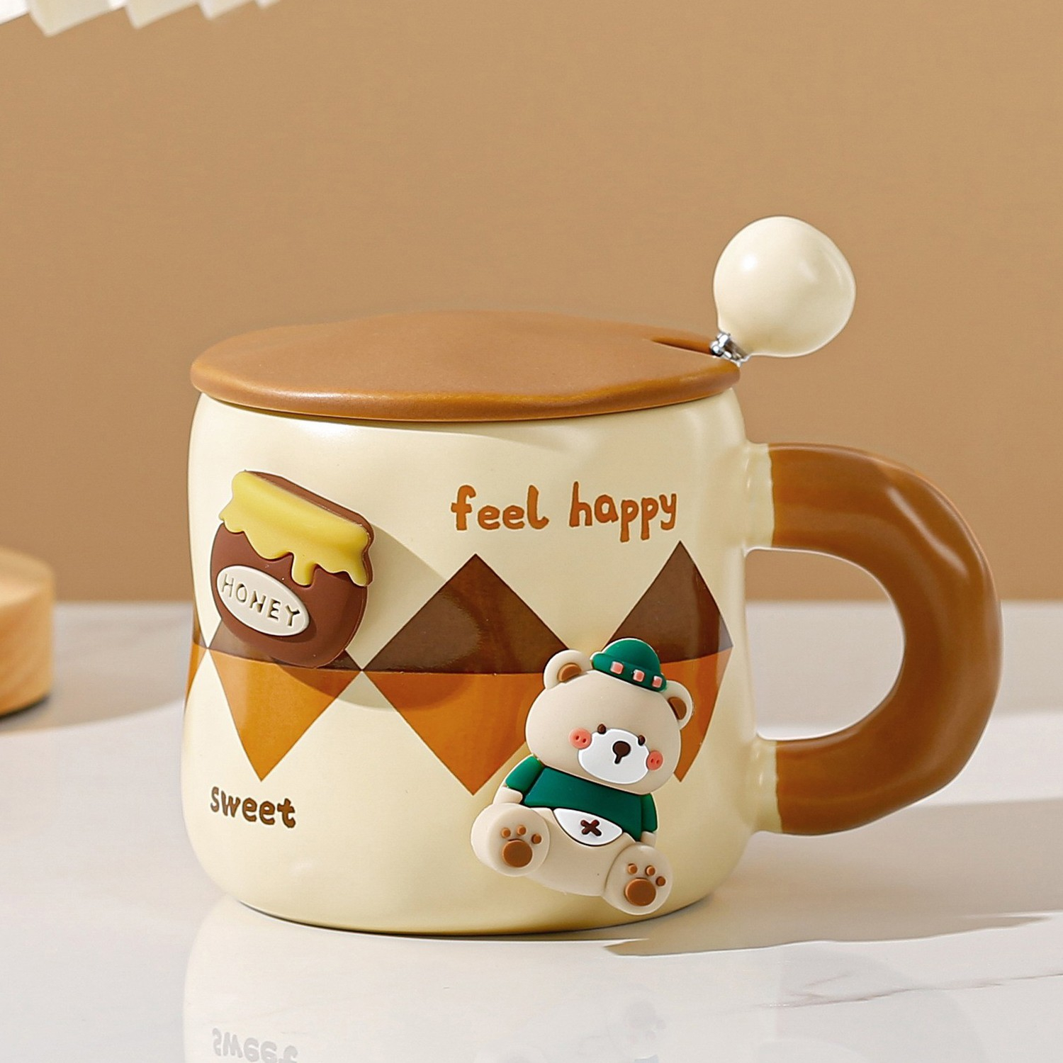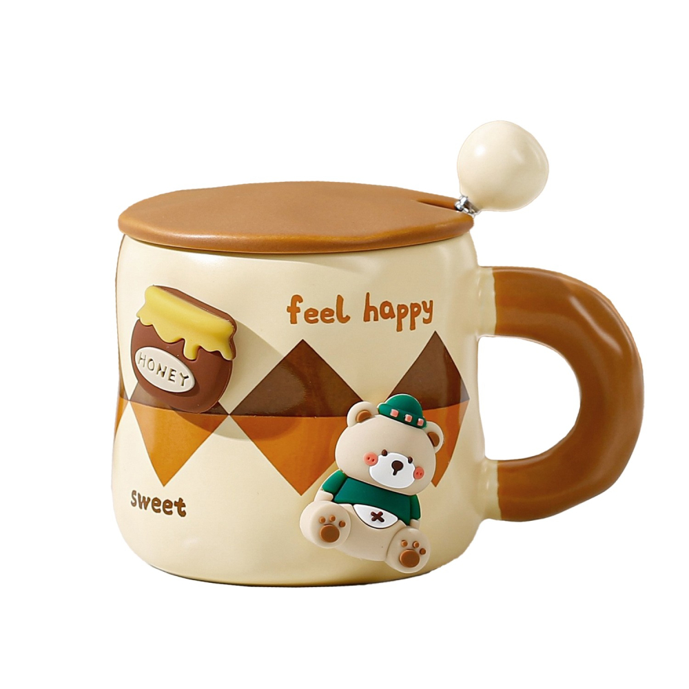 Cana din Ceramica, Model Urs pentru Baieti, Cana Universala, Cana pentru Ceai, Cana cu Lingura Metalica si Capac