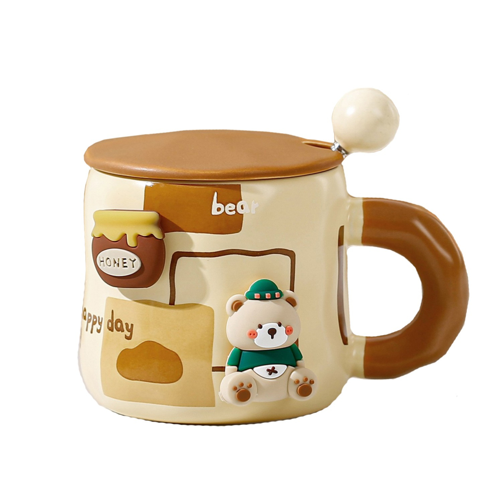 Cana din Ceramica, Model Urs pentru Baieti, Cana Universala, Cana pentru Ceai, Cana cu Lingura Metalica si Capac, 9.6 x 9.5 x 9.5 cm, 400 ml Bej