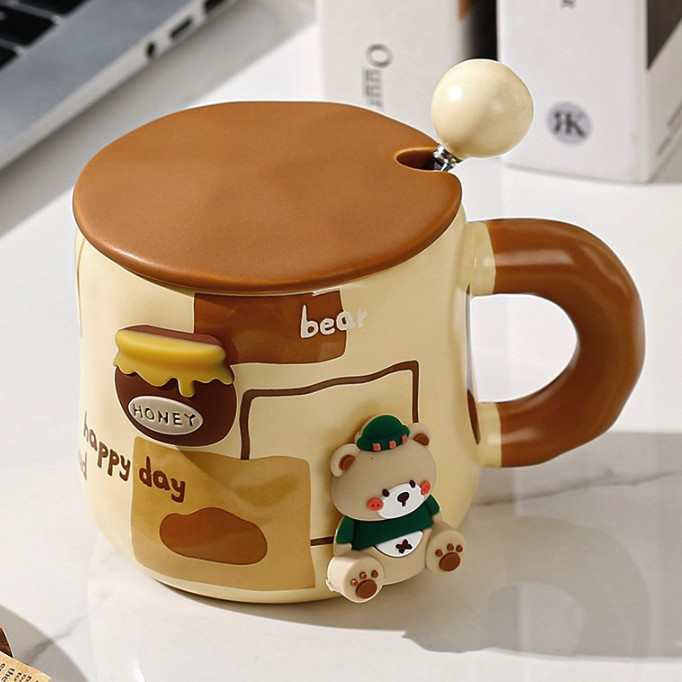 Cana din Ceramica, Model Urs pentru Baieti, Cana Universala, Cana pentru Ceai, Cana cu Lingura Metalica si Capac